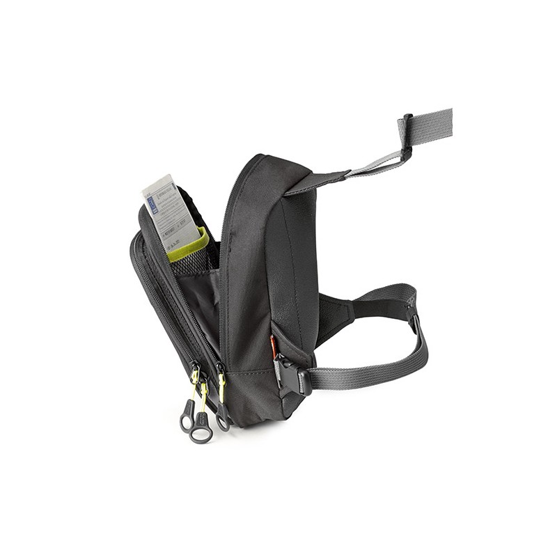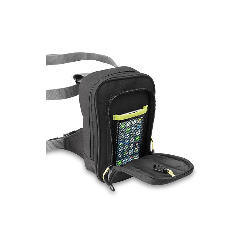 Con: cinghia regolabile in vita o allo coscia, scomparto principale con tasca interna in rete e frontale con porta cellulare.